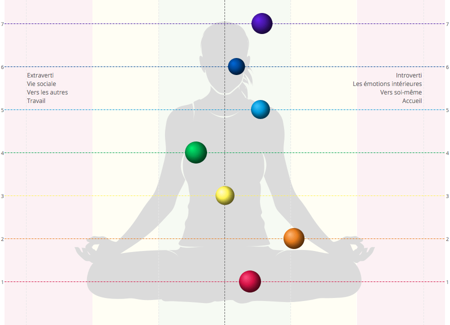 | VIOLET | Sommet de la tête | Lumière | Volonté, conscience et créativité | Spiritualité, super-conscience, réalisation de soi |